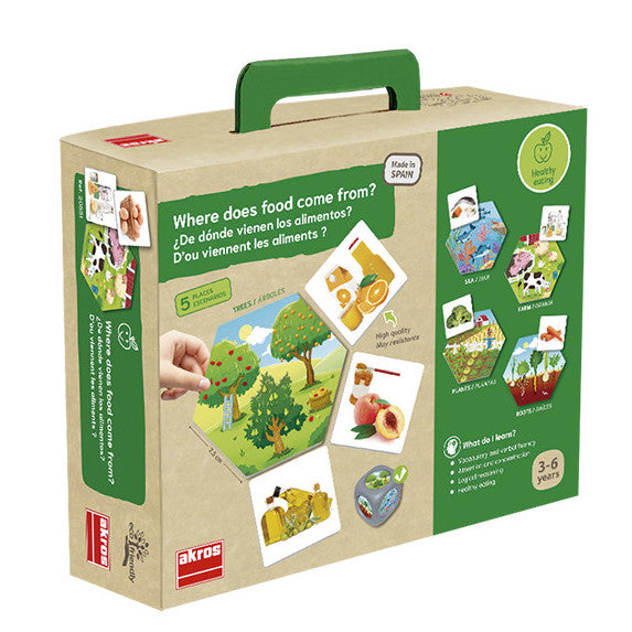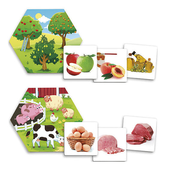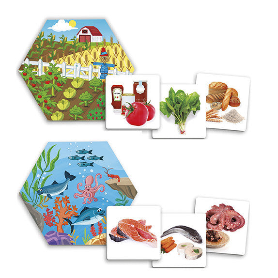 Izglītojoša asociāciju spēle bērniem, kas palīdz saprast — no kurienes nāk mūsu ēdiens. Spēlē bērni klasificē pārtikas produktus pēc to izcelsmes vietas (piemēram, lauksaimniecība, ūdens, koki u.c.).