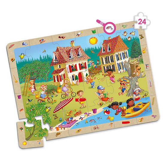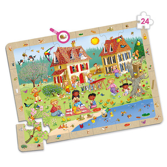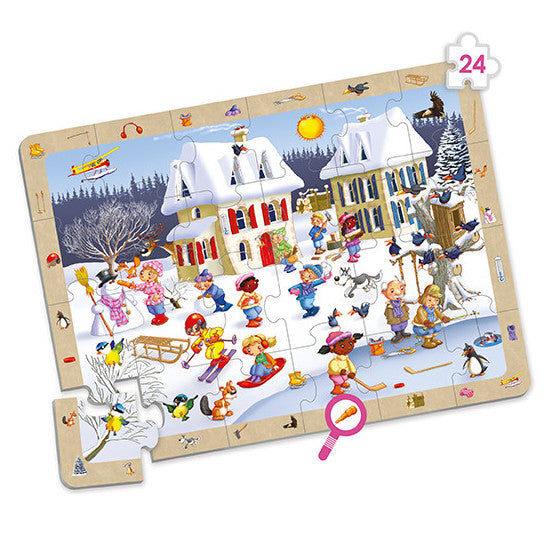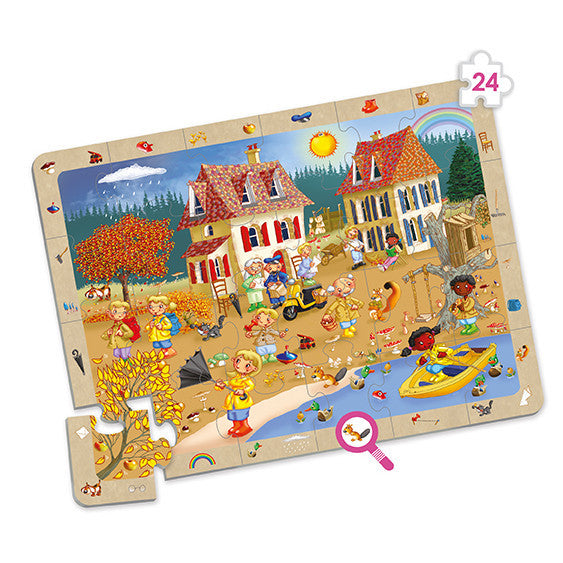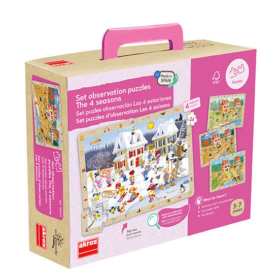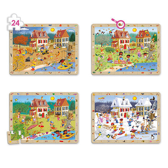Šis komplekts satur četras izturīgas, videi draudzīgas (ECO) puzles, katra ar 24 lielām un biezām kartīšu detaļām, kas kopā veido sezonu ainavas — pavasari, vasaru, rudenī un ziemu. Katrs attēls ietver īpašu rāmi vai vāciņu ar konkrētiem simboliem vai objektiem, kurus bērni var meklēt un mācīties atpazīt.